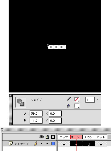 今度は形状を変化させるためのボタンを作成する。 新規シンボルでボタンを作成し、各フレームを設定する。