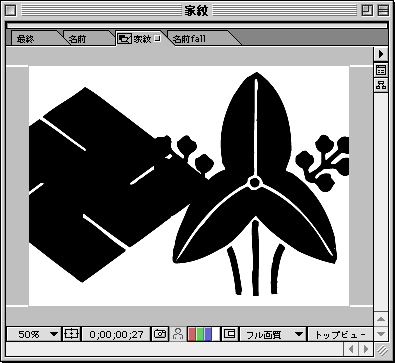 先日知人に、とある著名人の結婚式の映像を頼まれた。結婚式でのVJの依頼はものすごく多いのだが、それが本業になっても困るので基本的には断っているのだが、ごく稀に断れない場合やむしろやりたい場合なんかもあって、これはその一つだった。この時は素材として両家の家紋を渡されてこれをどうにかして欲しいという依頼であった。素材が家紋なら思い切り和風にしようかなと思っていたところに、名前はローマ字でという依頼が追加され悩んだ結果の一つがこれ。