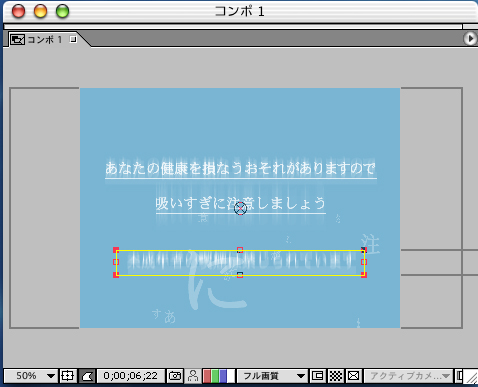 | 今回は最後の回であり、3行目が現れてから2秒間静止して最後に全て消えていくところまでをやってみよう。はじめに3行目が現れるところだがこれはブラー(モーション)を使用して角度を90度、強さと不透明度を徐々に弱めていくフッと現れてくる感じをだす方法を使おう。 |
